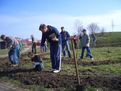 Für das leider vom Zahn der Zeit zerstörte Holzlabyrint soll ein neues entstehen und zwar aus Weiden. Nach mühsamer Vorbereitung des Bodens wurden die Setzlinge gesteckt- hoffentlich wachsen sie gut an!