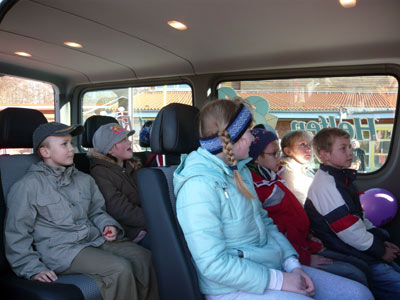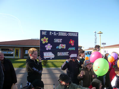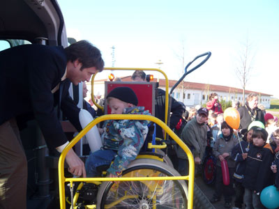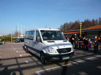 | Viele kleine Beträge von vielen Spendern summierten sich auf tolle 36000 Euro- und nun steht er da unser Bus. Insgesamt 8 Personen kann er transportieren, dazu kommen zwei Rollstühle, die mit einer Hebebühne geladen werden. Eine große Erleichterung für unsere Schule, die unsere Mobilität ungemein erhöht. So sind Fahrten zum externen Sprachunterricht, Schwimmtraining, Wettkämpfen und Ausflügen viel einfacher zu realisieren. |