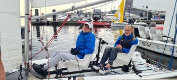 Die Besonderheit besteht darin, dass je eine Person mit und eine Person ohne Handicup zusammen segeln. Die Botte wurden vom Veranstalter gestellt. Wir waren mit 12 interessierten Schülern vor Ort und konnten die Boote testen und erste Eindrücke dieser schönen Sportart gewinnen. Leider ließ uns der Wind etwas in Stich..