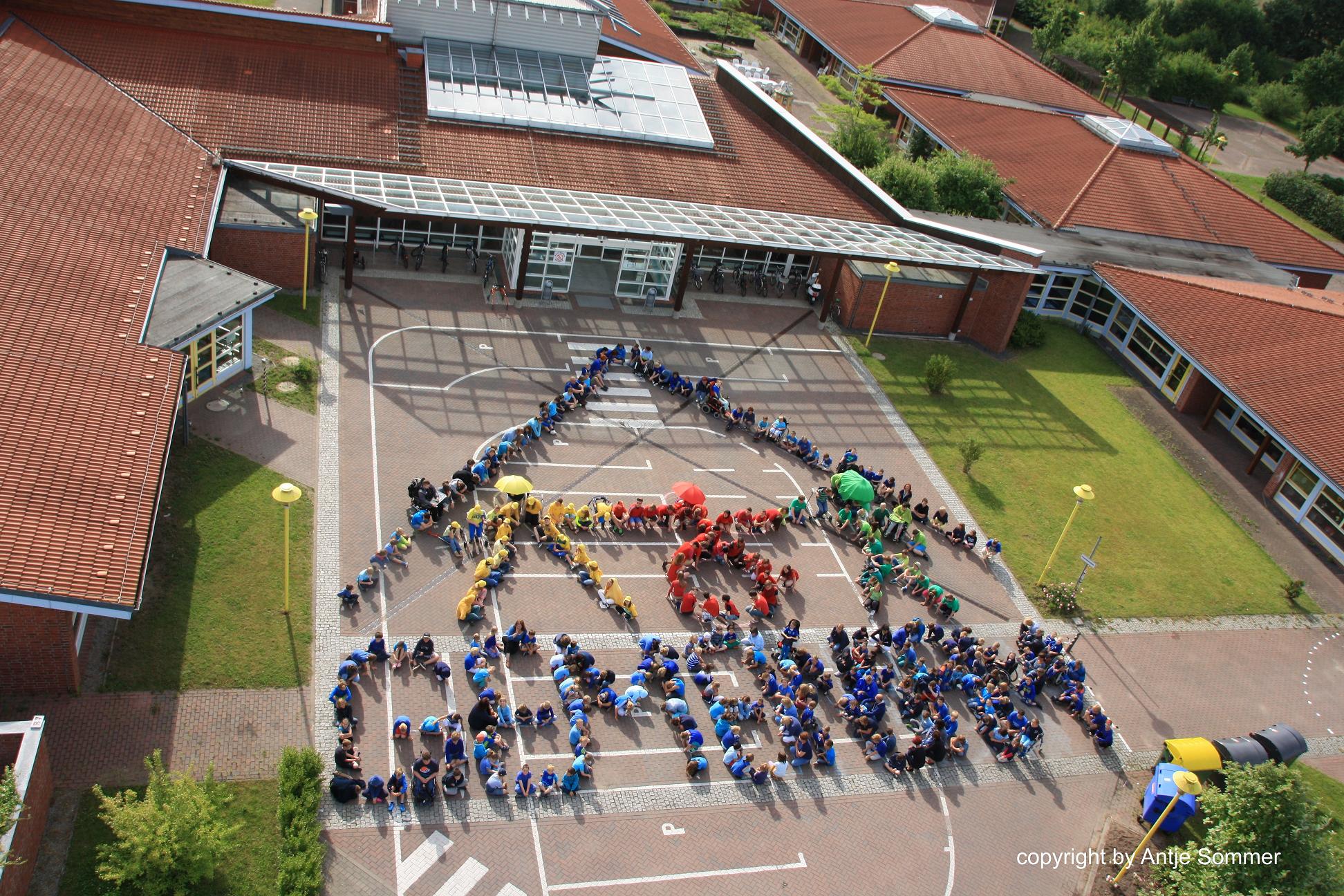 Schüler unserer Schule stellten unser Schullogo dar. Durch Intiative unserer Jahrbuchredakteurin Frau Sommer wurde das Logo maßstabsgerecht auf den Schulhof übertragen. Das Foto machte sie selbst nach mehreren Proben von einer Feuerwehrleiter aus, da es mit dem Flugzeug nicht klappte.